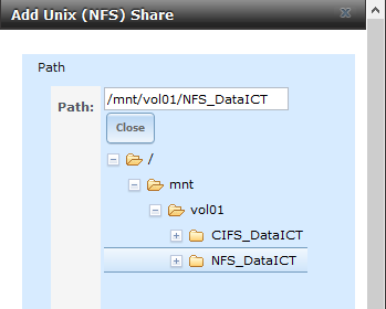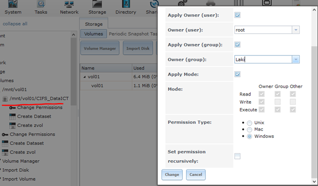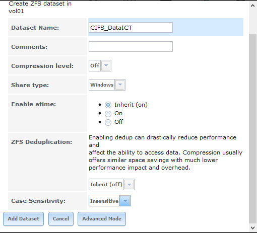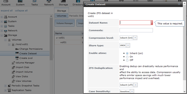 Storage > Volumes > /mnt/vol01 > Create Dataset