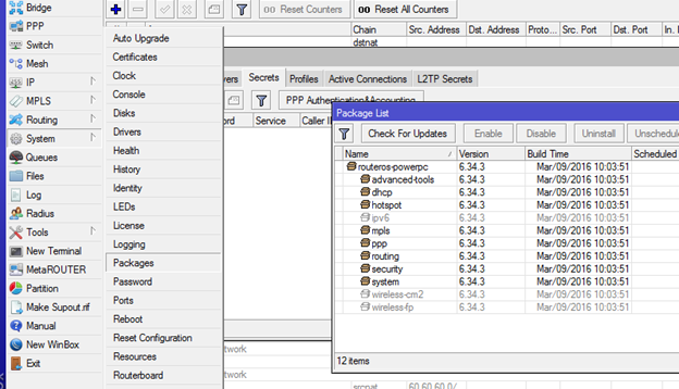 1. Pastikan paket PPP telah terinstall di Mikrotik System > Packages