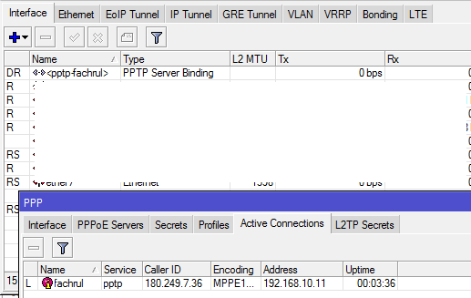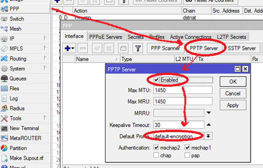PPP > tab Interfaces > klik PPTP Server > centang pada bagian Enabled dan pastikan pada bagian Default Profile menggunakan default-encryption