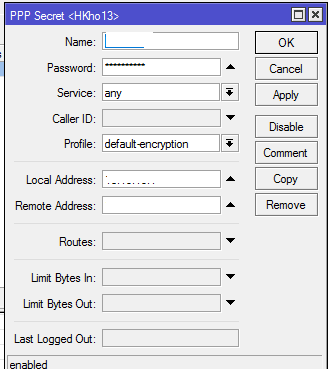 Remote Address: IP yang akan digunakan oleh PPTP Client