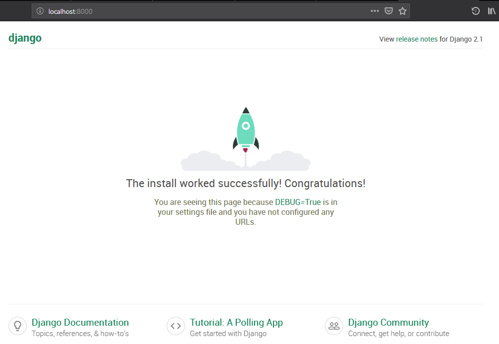 Selanjutnya buka browser dan jalankan localhost pada port 8000 (default django)Sampai di sini, kita telah berhasil menginstall django, langkah selanjutnya adalah akan kita bahas pada postingan berikutnya mengenai pembuatan skeleton proyek.