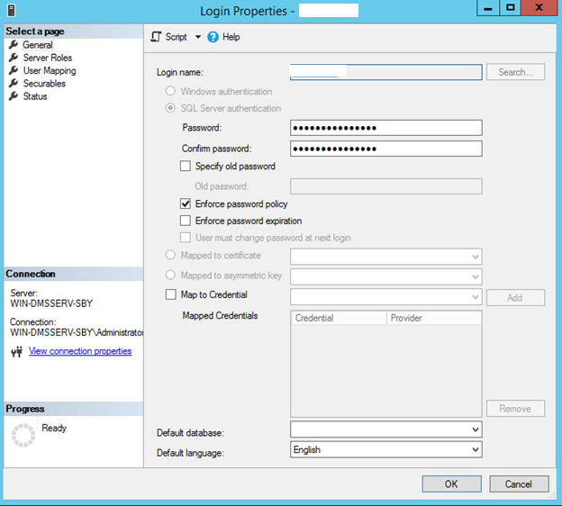 1. Buka aplikasi Management Studio. Pilih Security > Logins > New Login. Masukkan Nama user dan password serta pilih default database
