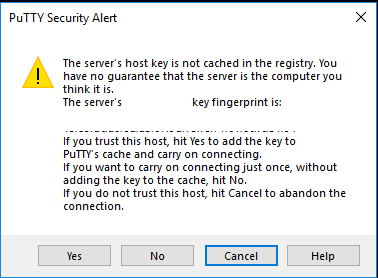 Nomaka putty akan tetap melanjutkan koneksi ke server, tetapi tidak menyimpan identitas key ssh (fingerprint) di registri Windows. Canceljika tidak ingin melanjutkan koneksi.- Kalau tidak ingin mendapat peringatan putty, hapus terlebih dahulu ip server yang sebelumnya melalui putty cache registry di