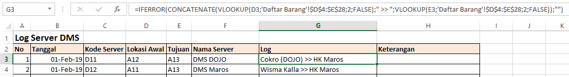 =IFERROR(VLOOKUP(C3;'Daftar Barang'!$A$4:$B$50;2;FALSE);"")=IFERROR(CONCATENATE(VLOOKUP(D3;'Daftar Barang'!$D$4:$E$28;2;FALSE);" >> ";VLOOKUP(E3;'Daftar Barang'!$D$4:$E$28;2;FALSE));"")